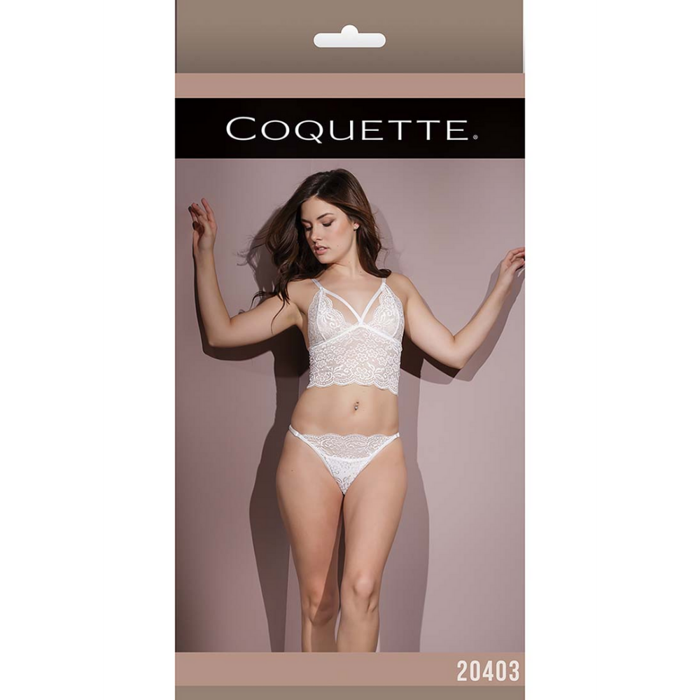 Longline bralette with sexy crotchless panty. The scallop lace fabric is stretchy. The cups on the bralette have strappy details and the panty has adjustable straps on the size, this makes it possible to adjust the size. *The G-String worn under the panty is not included.